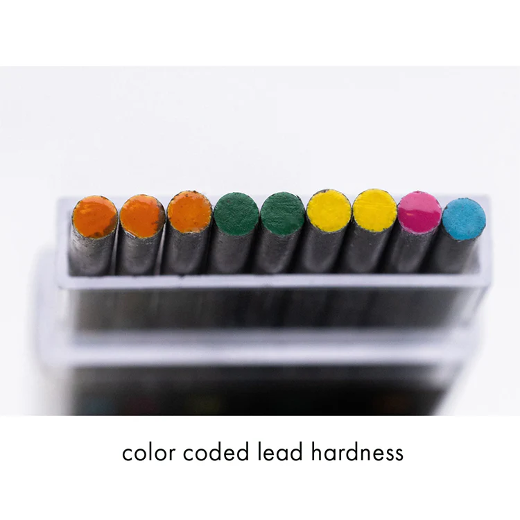 - Set of 9 2.0mm graphite lead range (4B, 2B, HB, 2H, 4H) with color labeling.